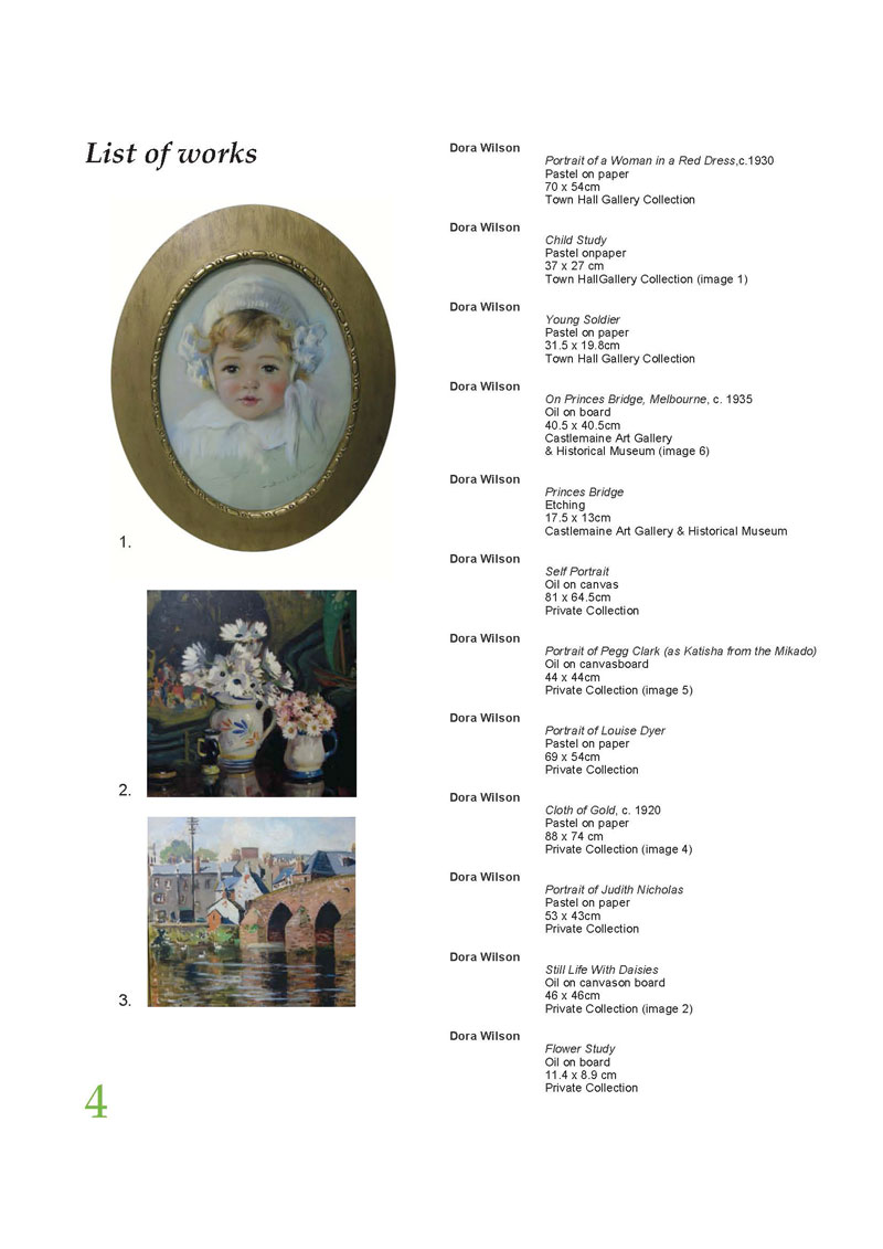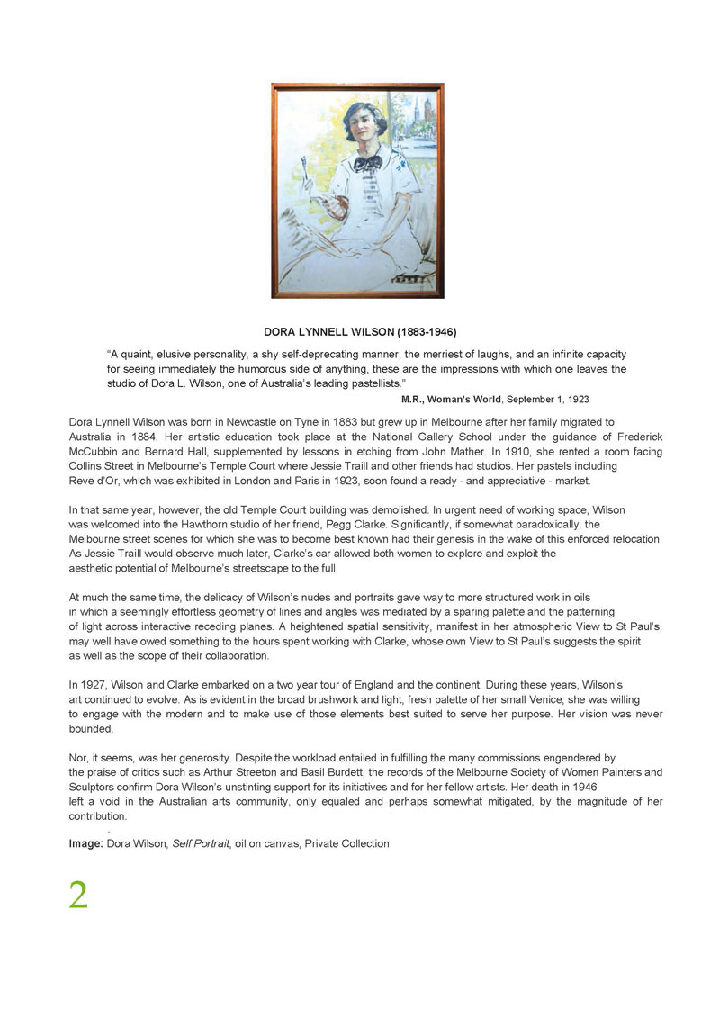 Wilson was schooled at Methodist Ladies’ College before studying at the National Gallery schools under the watchful eyes of Bernard Hall and Frederick McCubbin. Working primarily in painting and pastels, her subject matter varied from landscape to portraiture and nudes. In 1923, she contributed to the Exhibition of Australian Art in London and the popular magazine of the time, Woman's World, reproduced on its cover her painting 'Reve d'Or'.