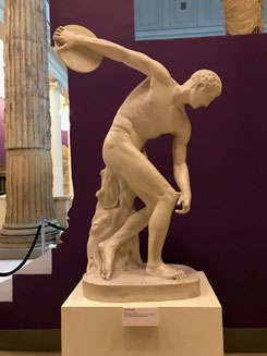 In its pensive mood this figure differs greatly from the famous fifth century sculpture The Discobolus by Myron, which shows an athlete in full swing just before release of the discus.