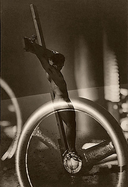 Max Dupain made use of the Discobolus in several other surrealist images of a more theatrical nature. In the same year as Shattered Intimacy he made The Apotheosis of Man a montage of the head of the Discobolus overlaid by a saxophonist wearing a gas mask. In Doom of Youth 1937 while not using a Greek figure has a man on a cross ground down by cog and with a serrated knife looming suggesting the sacrifice of youth.11 In an untitled work the figurine is overlaid by a ghostly wreath of leaves mocking the laurels given to victorious athletes or soldiers.