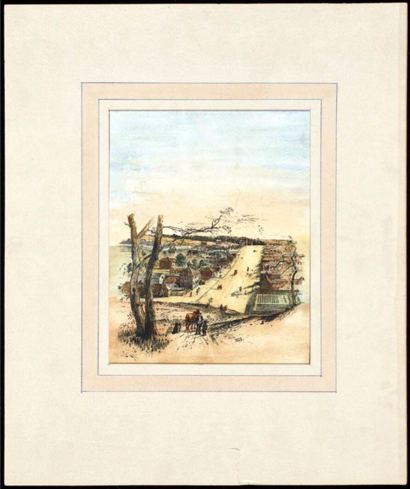 The lithographed scene is of an ordered established settlement of cottages and substantial buildings interspersed with scraggly native trees. Men, women and children are busy with barrows, carts, horses, animals and vegetable gardens. The cart going down the hill has initials ‘J C’ of the publisher on a sack.