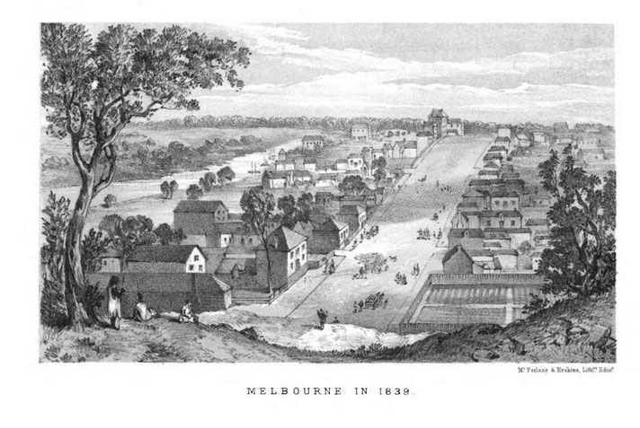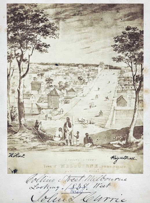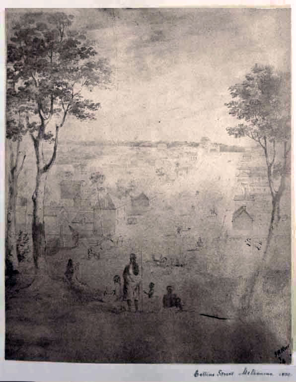 At the centre foreground of the lithograph three Wurundjeri adults and child stand on the small hill at the eastern end of Collins street at about the present day site of the Old Treasury Building. The elevated viewpoint looking west towards market street emphasises the very generous wide street plan instituted by Surveyor Robert Hoddle in 1837.