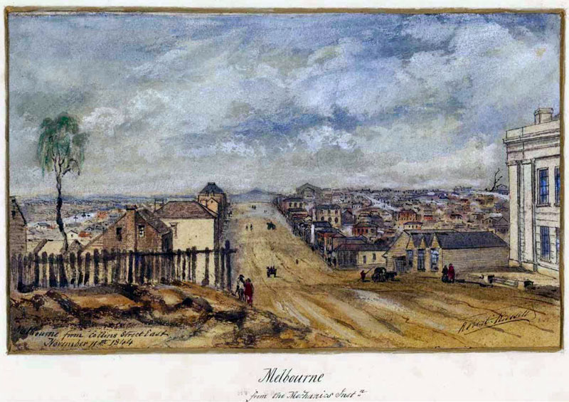 | 1844:Melbourne from Collins Street east, the Mechanics Institute, Robert Russell |
