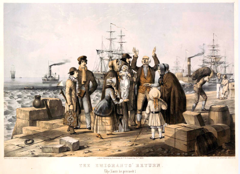 | 1853: The emigrants' return, the Lord be praised! Lithograph, Nathaniel Bliss Stocker Published London by Ackermann & Co., |