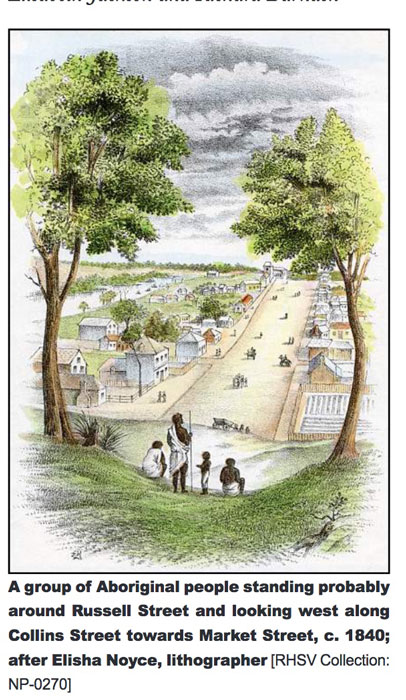 The Aboriginals who are dressed in toga like garments appear to benignly approve the progress of the settlement having sold the land to John Batman by treaty in 1835. In 1839 George Robinson of the newly formed Port Phillip Aboriginal Protectorate was actually discouraging Aboriginal people from entering the town and breaking up their camps by the Birrarung (Yarra River).