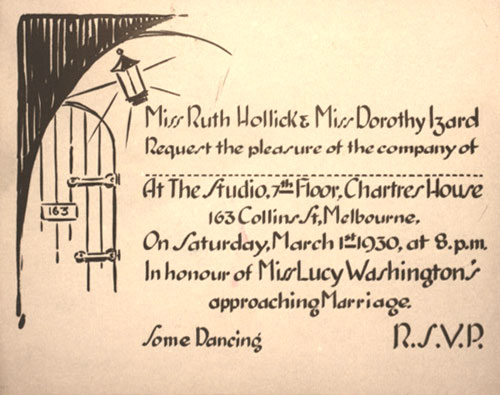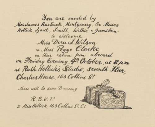 Invitation to a party to welcome back Pegge Clarke and Dora Wilson.