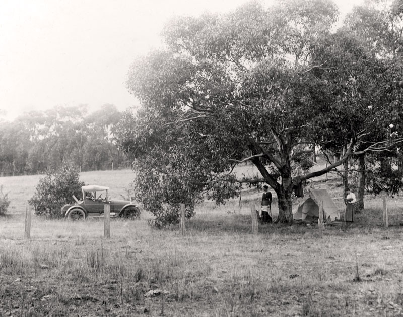 | Camping scene. Speculation is that this is circa 1920s - given the women look young and the age of the car. |