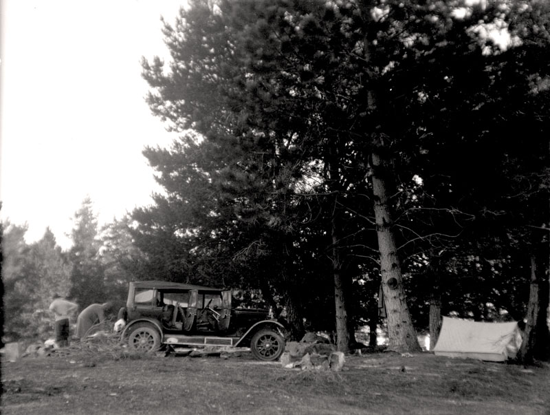 A camping scene; possibly closer to 1930s as the car is maybe a 1926 Fiat 502 -