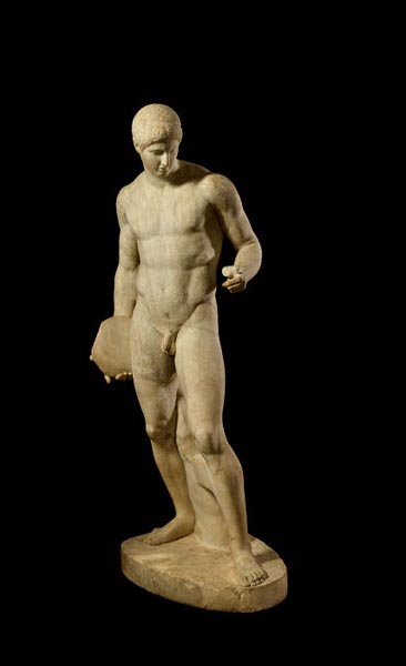 In its pensive mood this figure differs greatly from the famous fifth century sculpture The Discobolus by Myron, which shows an athlete in full swing just before release of the discus.