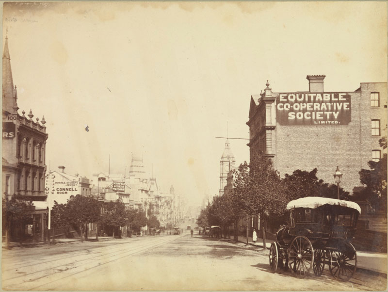 1875: View of Collins Street, Melbourne, looking west near the intersection with Russell Street.