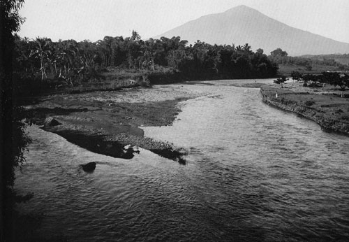 | #087: Another view of the hospital, this time across the Tjimanoek, with Goentoer in the clouds. The man in the foreground has gathered stones from the river and is transporting them in sturdy woven bamboo baskets. |